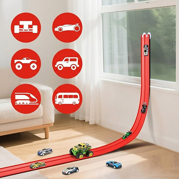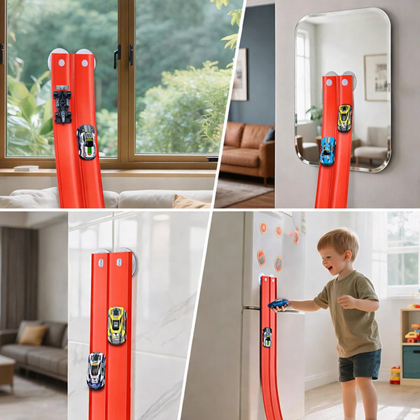 Die Befestigung mit Saugnäpfen ermöglicht es Kindern und Eltern, Winkel und Layouts schnell anzupassen, sodass die Strecke immer wieder neu aufgebaut werden kann – ganz ohne Werkzeug oder komplizierte Montage.