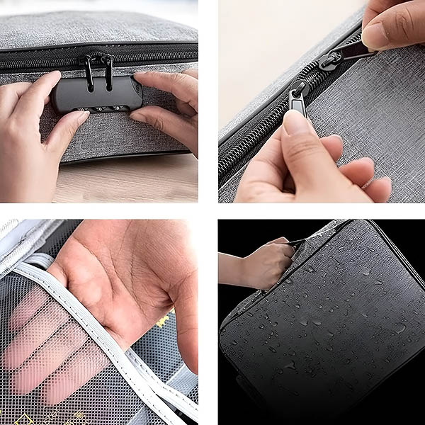 Machen Sie sich Sorgen um die Sicherheit Ihrer wichtigen Dokumente und Wertgegenstände? Diese wasserdichte Tasche ist mit einem sicheren Codeschloss ausgestattet, das dafür sorgt, dass Ihre Dokumente, Ihr Geld und Ihr Schmuck für andere unzugänglich bleiben.