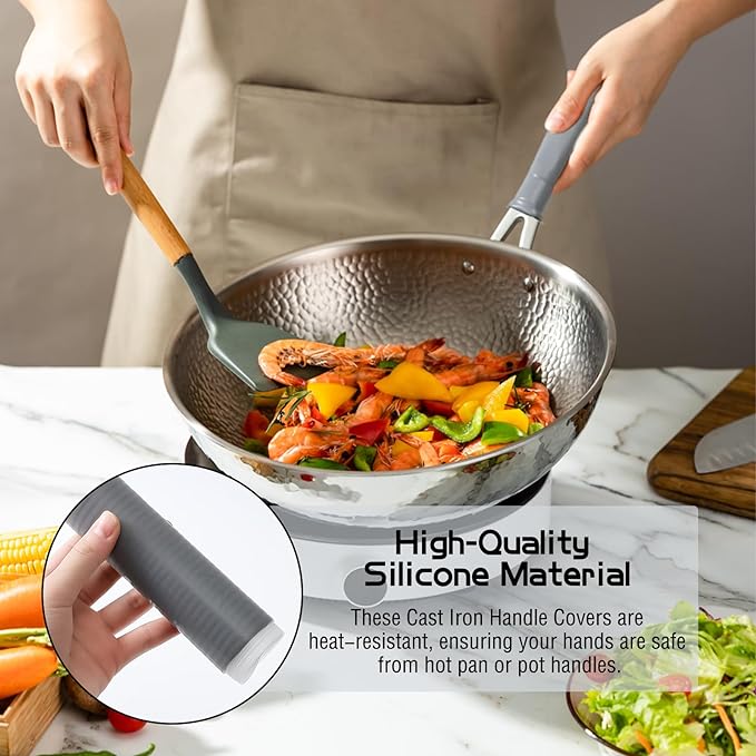 Unsere Silikonabdeckungen sind so konzipiert, dass sie mit einer Vielzahl von Topf- und Pfannengriffgrößen kompatibel sind, was sie zu einem vielseitigen und anpassungsfähigen Küchenzubehör macht, das sich perfekt für gusseiserne Pfannen und Pfannen mit flachem Boden eignet.